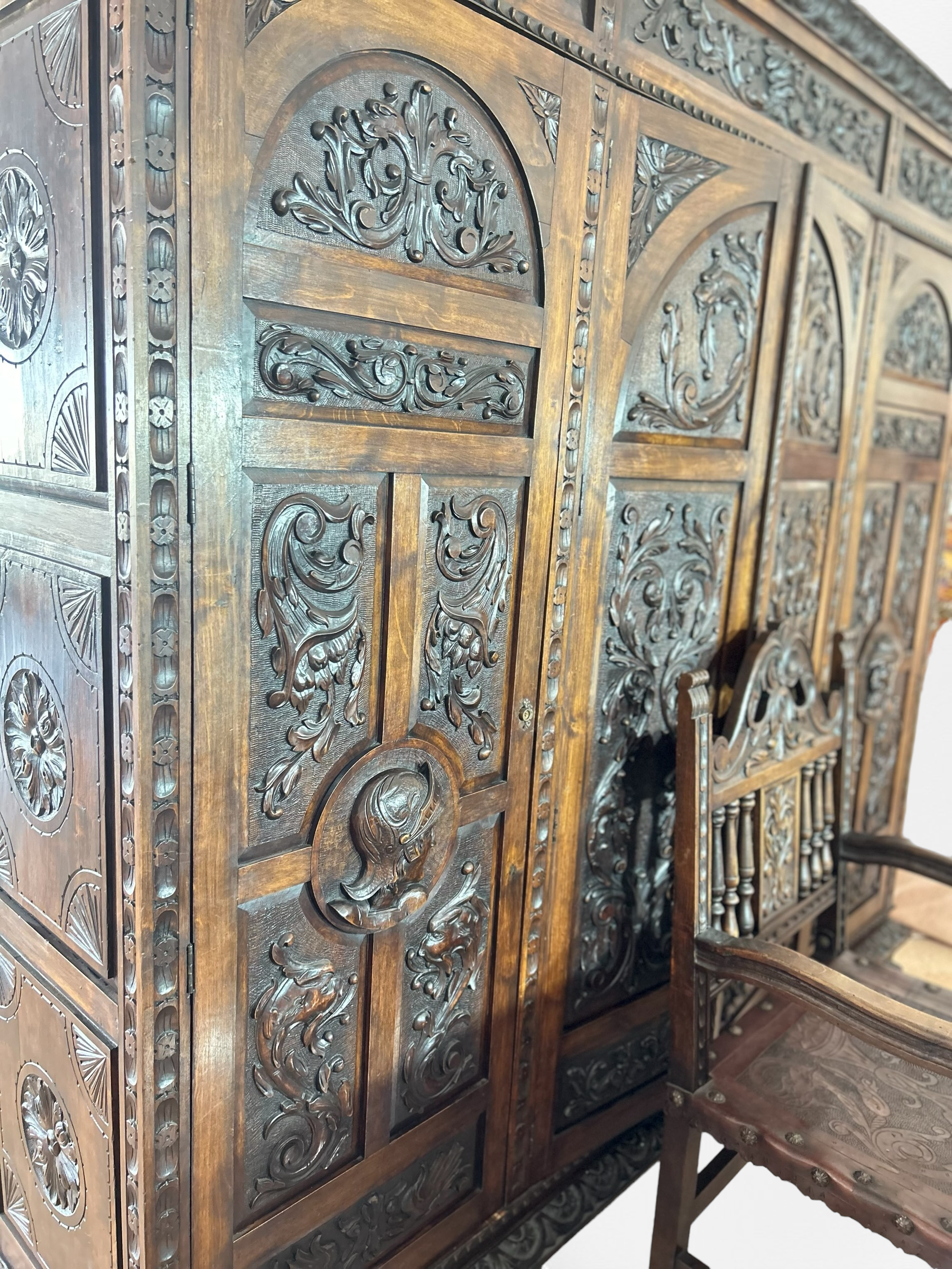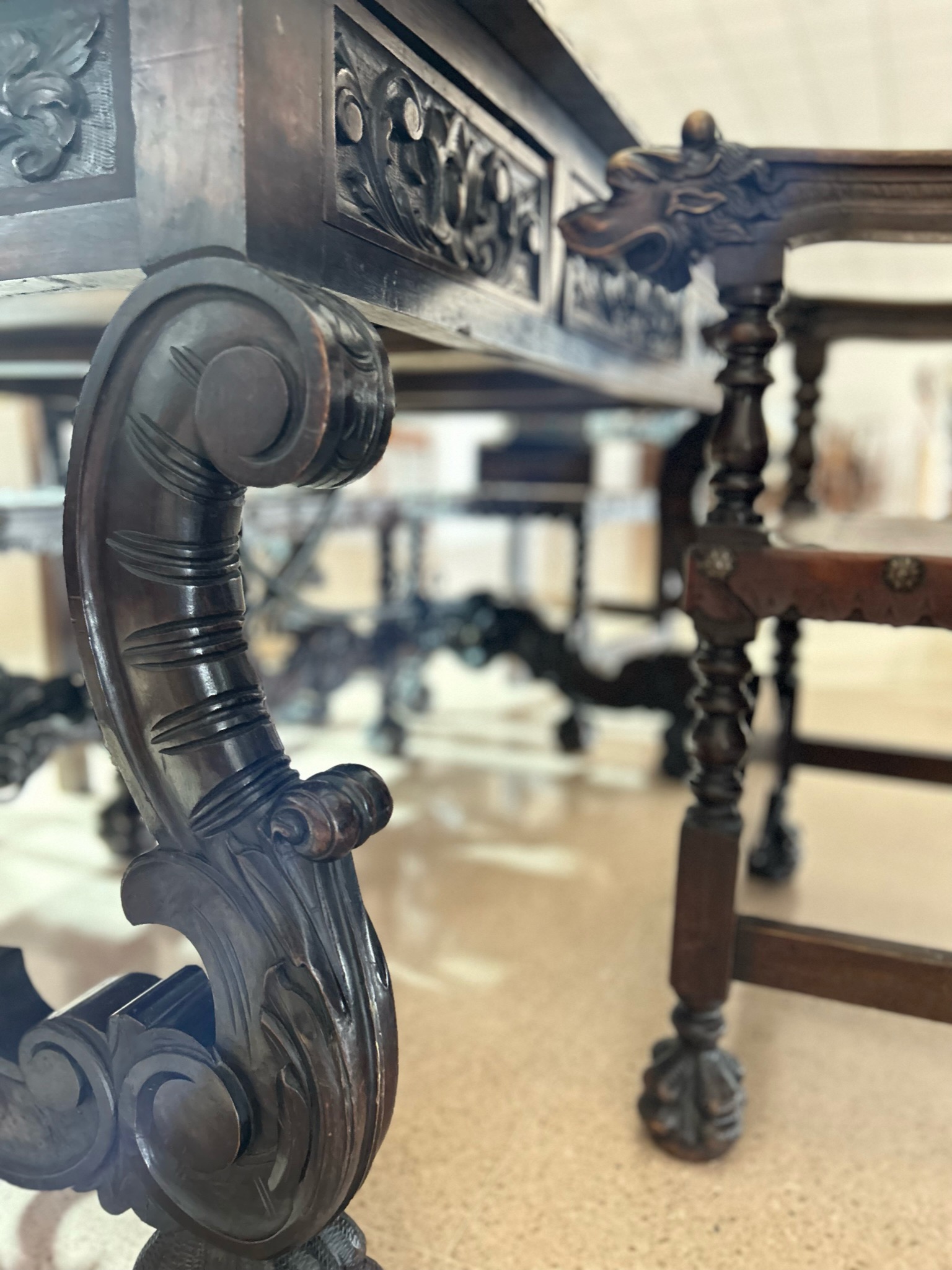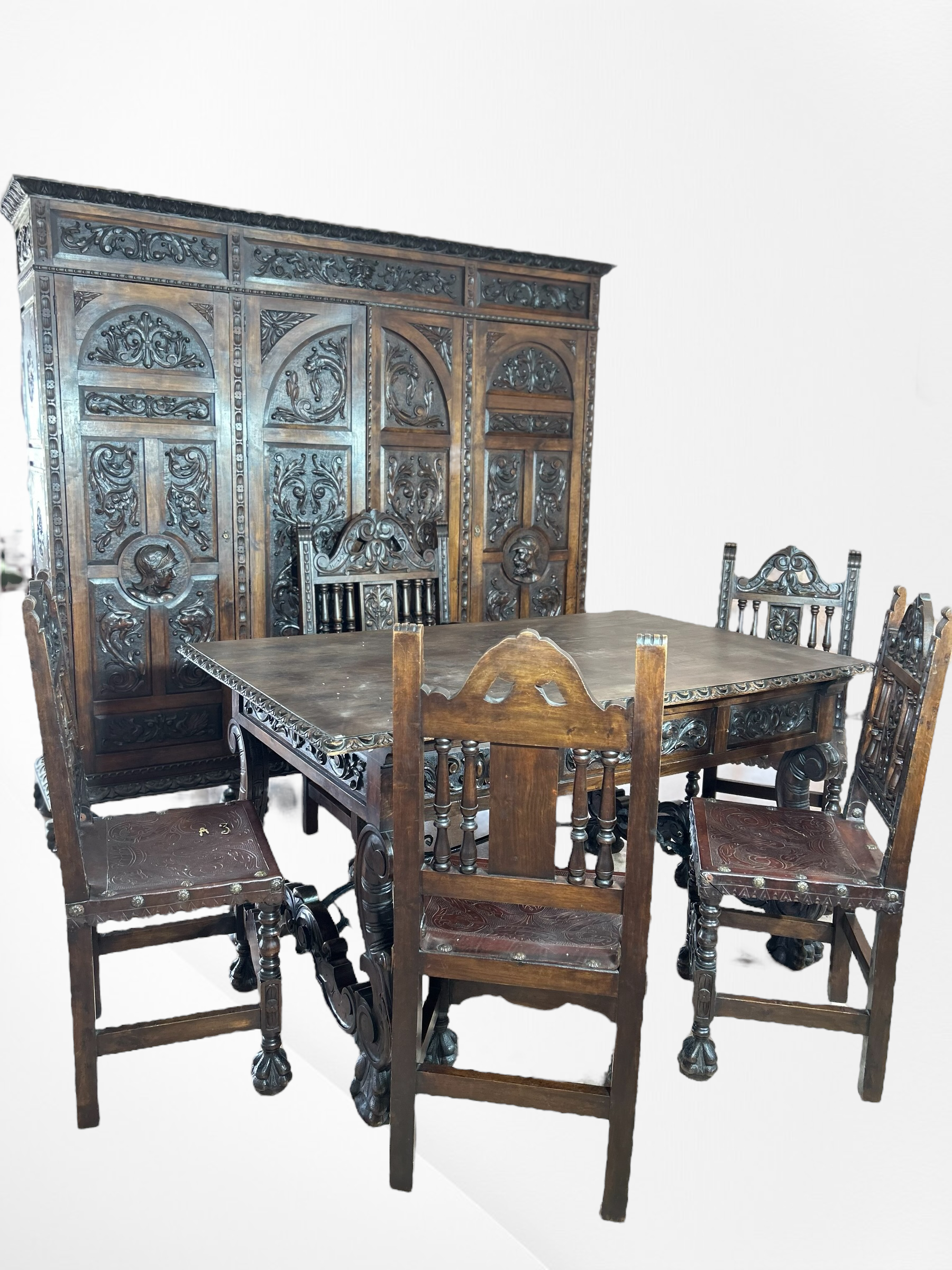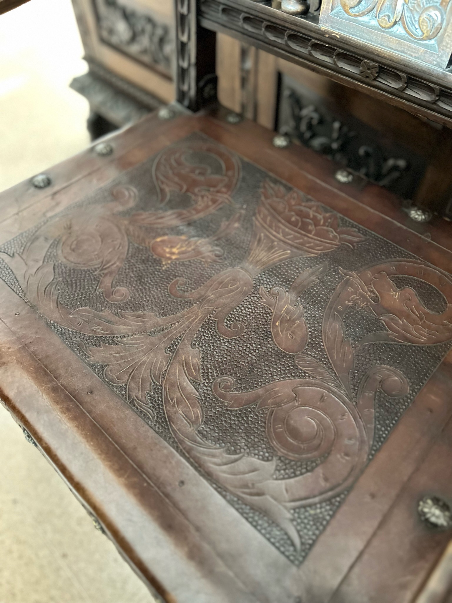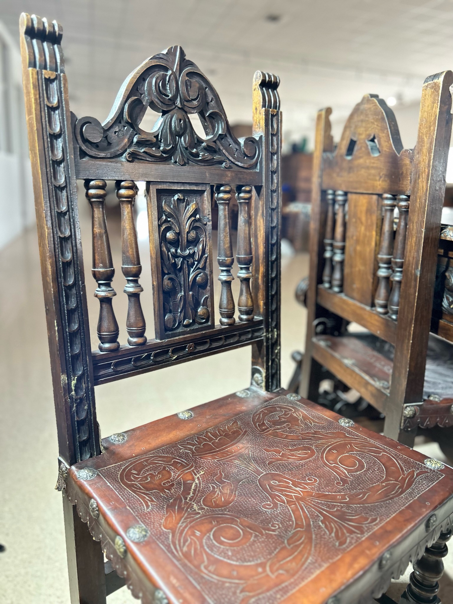 Despacho estilo español siglo XIX. Librería, mesa, sillón y 4 sillas talladas en cuero repujado.