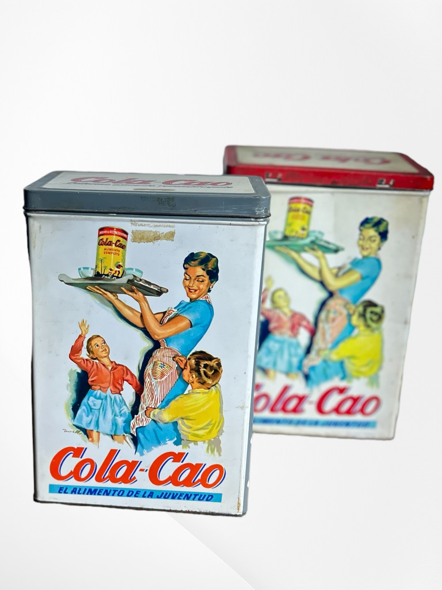 Latas vintage de Cola Cao en varios colores y diseños.
